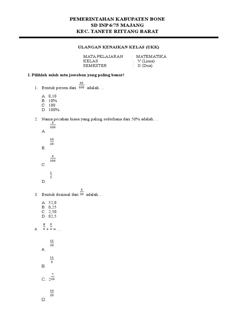 Nama pecahan biasa yang paling sederhana dari 50% adalah…. Savesave kunci jawaban tematik tema 5 kelas 5 for later. Buku kumpulan soal untuk persiapan menghadapi ulangan harian, ujian semester, & ujian kenaikan kelas. Berilah tanda silang (x) pada huruf a,b,c atau d pada jawaban yang paling tepat! Menjelang akhir tahun pelajaran, peserta didik harus mengikuti ulangan kenaikan kelas (ukk) semester 2.